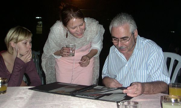 Vi hadde med en utklippsbok fra Tromsø om pengeinnsamling for proteseverkstedet i Gaza. Anniken og Astrid ser på bildene og forklarer ordføreren i Gaza, Majed Abu Ramadan.