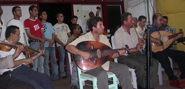 Koret Nordafør hadde i mars 2006 en Palestinakonsert i Tromsø med sangere fra Gaza. Ayman, på bildet er her med sitt faste orkester i Gaza, i skjorte fra Tromsø idrettslag.