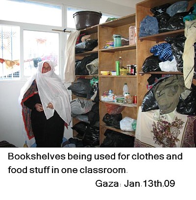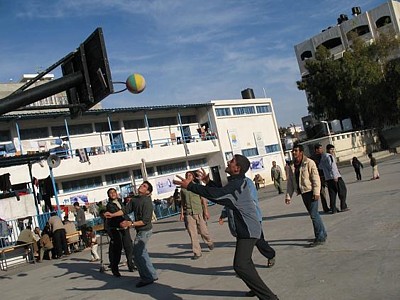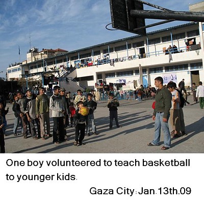 It is truly surprising how situation seems organized and under control. No stranger can get into school without being checked. Several young people stand by the gate making sure "residents" only get in. Guests get to register and given a guest pass. Some teenagers volunteered to coach children in sports games mainly basketball. Cleaning is done daily. Those who own cars, parked outside the school, volunteer to function as ambulances in case any injured or become ill. Shifa hospital, Gaza's main one, is not far from school.
