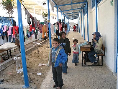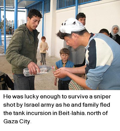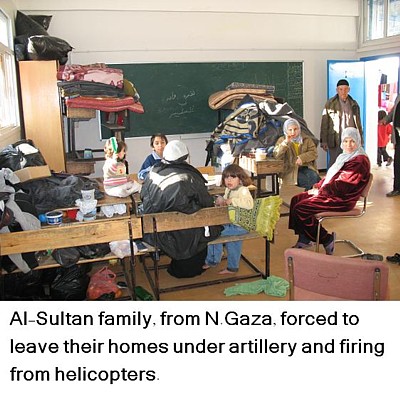 I went to one UN school, called New Gaza Elementary, located in central Gaza, where more than 700 people presently staying there. The majority of the new refugees there come from Beit-lahia, north of Gaza. The majority are villagers and farmers and used to live in extended -family homes. Al Sultan family is well known in west of Beit-Lahia and now most of them escaped to this UN school. People in the school repeated similar stories of how they escaped about one week ago. The most common one is when hundreds of people left homes running from artillery and gunfire from helicopters. One mother said we did not have enough time to put shoes on. Many relatives got killed on the way as rescuers and medics found out tens of dead people the following day in the area.
